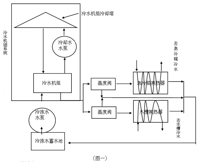 現(xiàn)階段大部分BOPP企業(yè)使用冷水機組作為冷卻設備,其系統(tǒng)循環(huán)一般如下:冷水機組系統(tǒng)(包冷卻水泵和冷水機組配套冷卻塔)制取冷凍水后直接將冷凍水輸送到生產(chǎn)線急冷輥及水槽的換熱器進行熱交換,以控制急冷輥及水槽中水的溫度達到生產(chǎn)工藝要求。具體如(圖一)所示