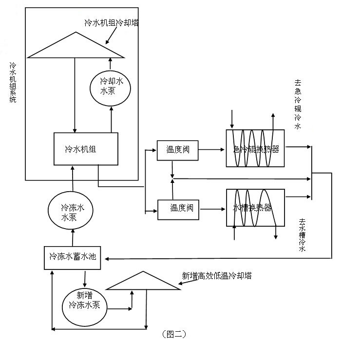 在原來冷水機組作為冷卻設備循環(huán)基礎上增加一臺循環(huán)水量800噸的高效低溫冷卻塔和配套一臺800m3/h水泵,本對原管道進行局部改動,由于高效低溫冷卻塔的出水溫度較原冷凍水高,換熱溫差小,故需增大生產(chǎn)線急冷輥換熱器和水槽換熱器。具體如(圖二)所示